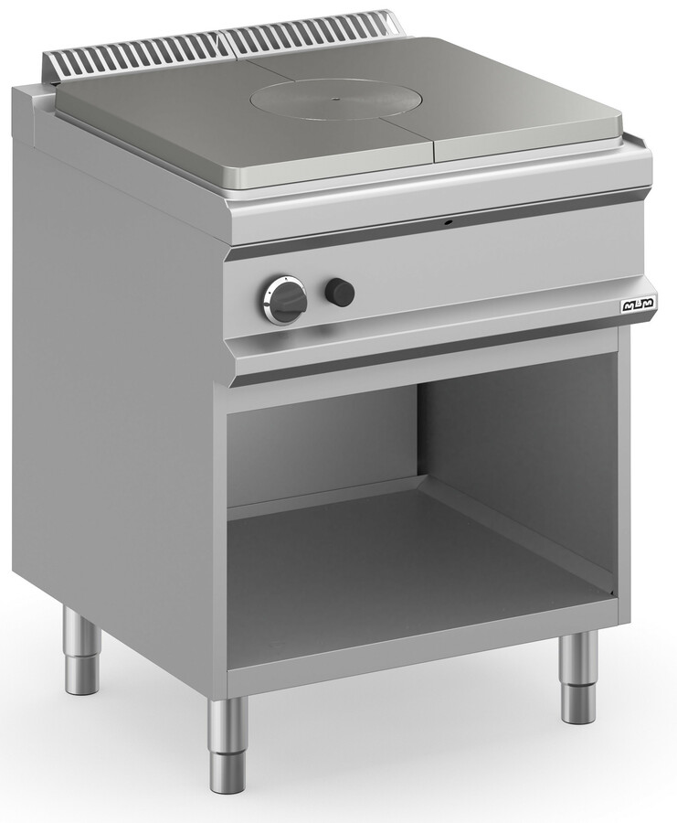 • El calentamiento de la plancha de cocción es a través de un quemador en acero de 9 kW, ubicado bajo el anillo central, con encendido piezoeléctrico y control termostático.