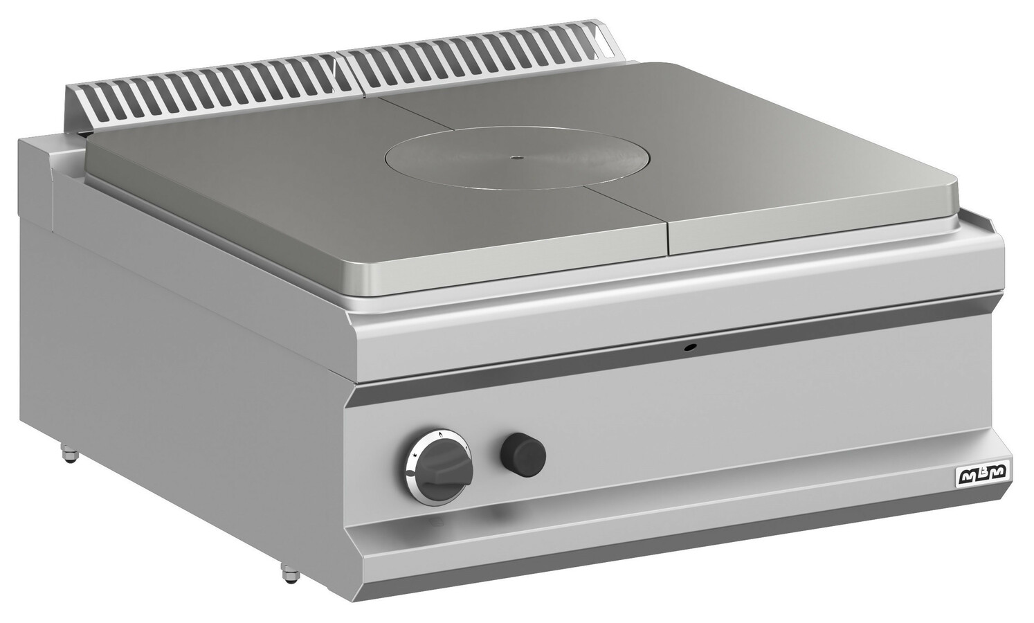 •En las versiones con funcionamiento eléctrico, la plancha de cocción, en acero dulce de 15 mm de espesor, es única pero presenta 4 zonas de cocción con control independiente.