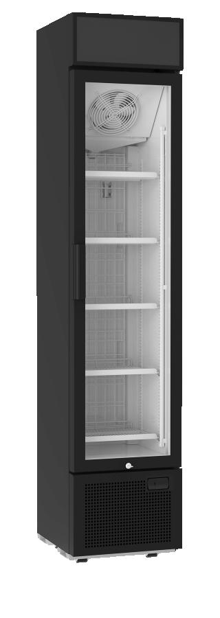 El congelador expositor estrecho FSF tiene una anchura de solo 435 mm, por lo que es ideal para lugares con espacio limitado para exponer productos congelados. Está equipado con una marquesina iluminada, estantes ajustables, iluminación LED interior y una puerta de cristal calefactada para una excelente exposición de los productos.