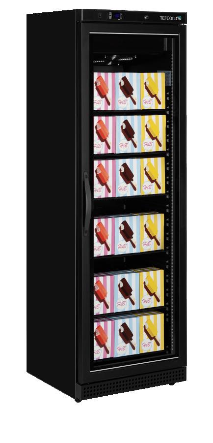 La gama de congeladores con vitrina UF400VG está disponible en negro o blanco con marco de puerta de acero inoxidable. Cuenta con refrigeración ventilada, descongelación automática y termostato digital. Con puerta de cristal calefactada, estantes ajustables e iluminación interior LED, ofrece una excelente presentación de sus productos congelados.