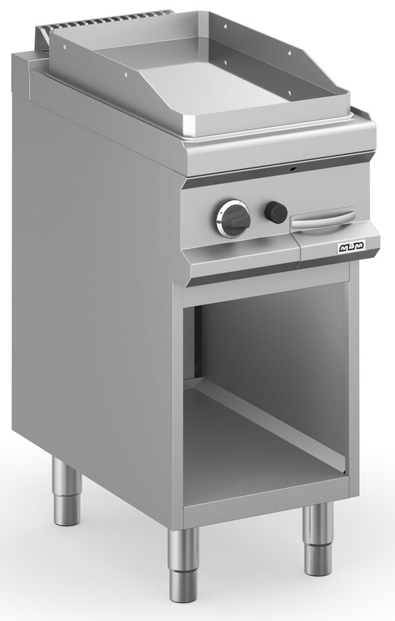 • La placa de cocción totalmente encerrada en la encimera de trabajo está hecha de acero dulce, con acabado pulido o en cromo duro, y tiene espesor de 15 mm.