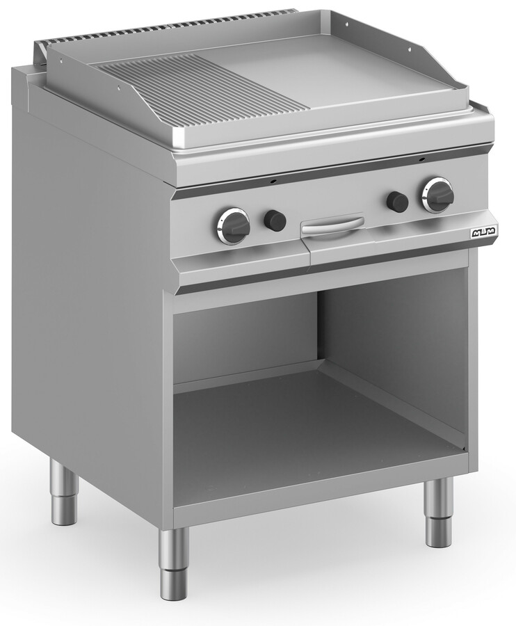 • La placa de cocción totalmente encerrada en la encimera de trabajo está hecha de acero dulce, con acabado pulido o en cromo duro, y tiene espesor de 15 mm.