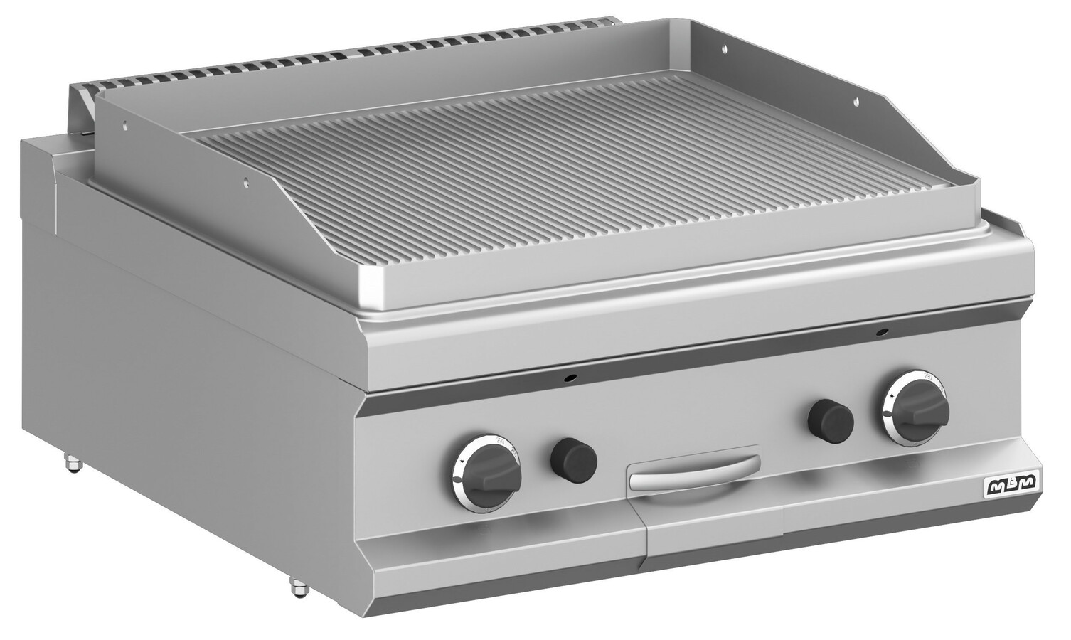• La placa de cocción totalmente encerrada en la encimera de trabajo está hecha de acero dulce, con acabado pulido o en cromo duro, y tiene espesor de 15 mm.
