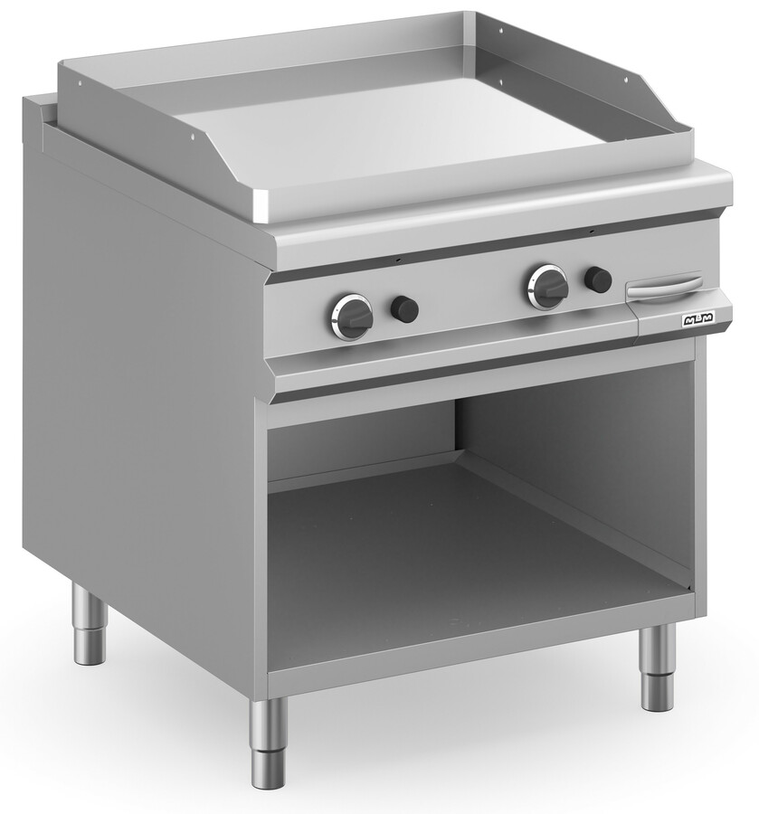 •La placa de cocción totalmente encerrada en la encimera de trabajo está hecha de acero dulce, con acabado pulido o en cromo duro, y tiene espesor de 15 mm.