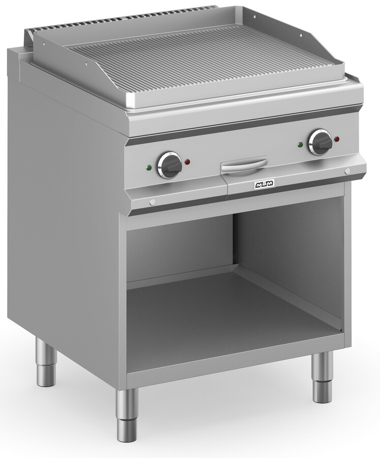 • La placa de cocción totalmente encerrada en la encimera de trabajo está hecha de acero dulce, con acabado pulido o en cromo duro, y tiene espesor de 15 mm.
