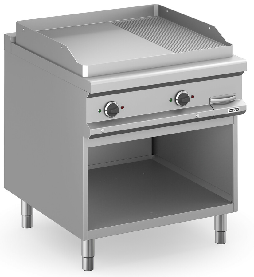 •La placa de cocción totalmente encerrada en la encimera de trabajo está hecha de acero dulce, con acabado pulido o en cromo duro, y tiene espesor de 15 mm.