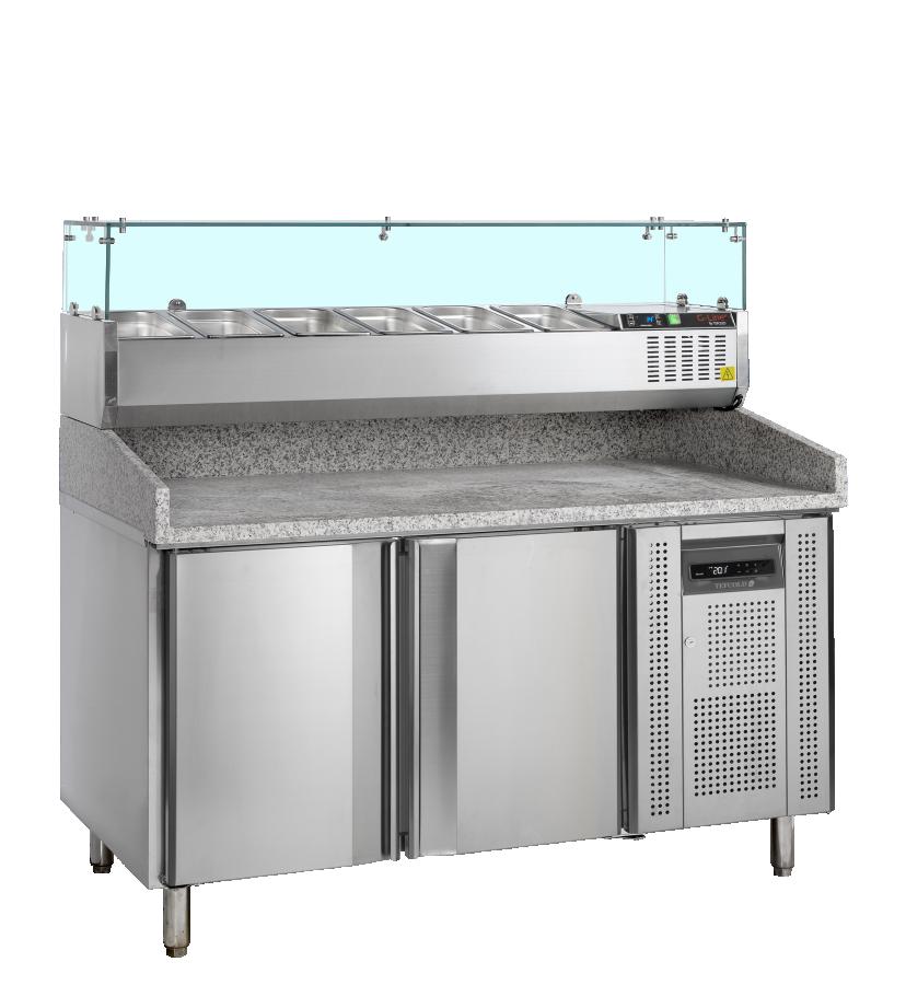 Acero inoxidable|Guías para 7 bandejas de pizza en cada puerta (400x600 mm)|Unidad de condimentos GVC38-200 para bandejas GN1/3|Encimera de granito|Refrigeración forzada|Descongelación automática|Puertas de cierre automático