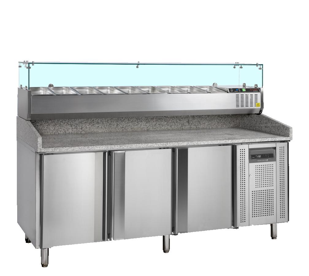 Acero inoxidable|Guías para 7 bandejas de pizza en cada puerta (400x600 mm)|Unidad de condimentos GVC38-200 para bandejas GN1/3|Encimera de granito|Refrigeración forzada|Descongelación automática|Puertas de cierre automático