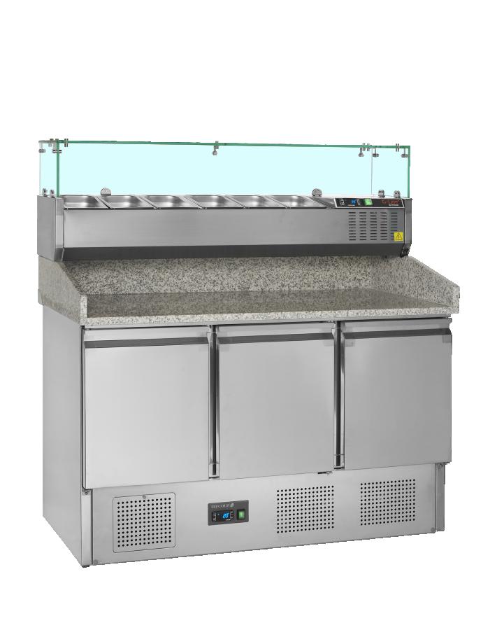 La gama PT de mesas para pizza está realizada en acero inoxidable SS304. Cuenta con una encimera de granito, que es ideal para elaborar pizzas, ya que se mantiene fría y dificulta que la masa se pegue a ella. Están disponibles en varios tamaños con 2 o 3 puertas. También es posible personalizarlas con cajones. Está disponible con o sin unidad de condimentos para bandejas GN1/3 las unidades de condimentos también se pueden incorporar posteriormente.