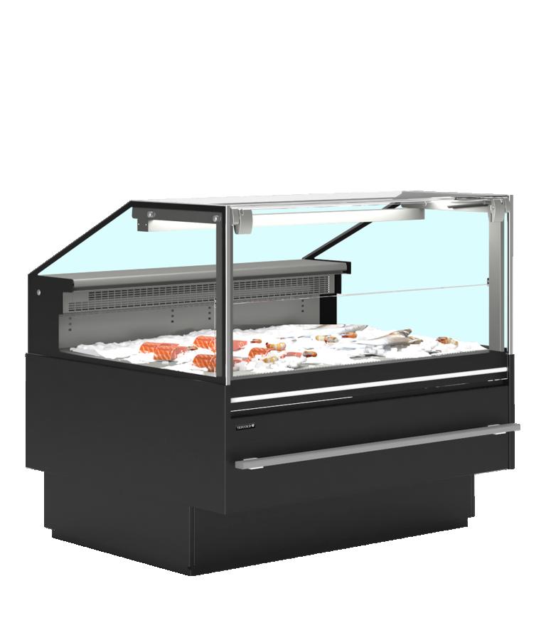 Excelente visibilidad de producto|Bandeja para hielo de 50 mm de profundidad|El frontal de cristal se eleva para una fácil limpieza|Cristal frontal antiempañamiento|Acabado negro|Refrigeración forzada|Temperature Class 3M1|Luz superior LED|Paragolpes de acero inoxidable|Estante trasero de acero inoxidable|2 tomas de 220-240V en la parte trasera|Kit de montaje como accesorio