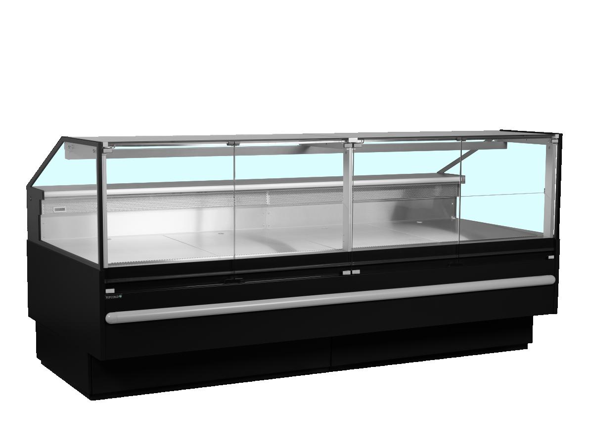 Acabado negro|Excelente visibilidad de producto|Cubierta de acero inoxidable de 825 mm de fondo|Cristal frontal antiempañamiento|El frontal de cristal se abre hacia delante para una fácil limpieza|Estante trasero de acero inoxidable|Refrigeración forzada|Temperature Class 3M1|Luz superior LED|2 tomas de 220-240V en la parte trasera|Kit de montaje como accesorio|Paragolpes